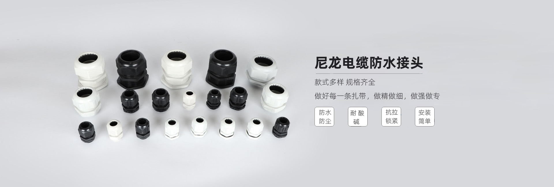 尼龍材質(zhì)適用惡劣環(huán)境 紅、灰、黑、深灰、白、藍(lán) 六種顏色 常規(guī):黑、灰兩種顏色,其它顏色需要定做 在嚴(yán)寒與高溫等惡劣環(huán)境下,保持長期不開裂不漏水 高密封性防水接頭保護(hù)電纜安全,長期使用不容易滲水
